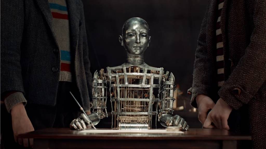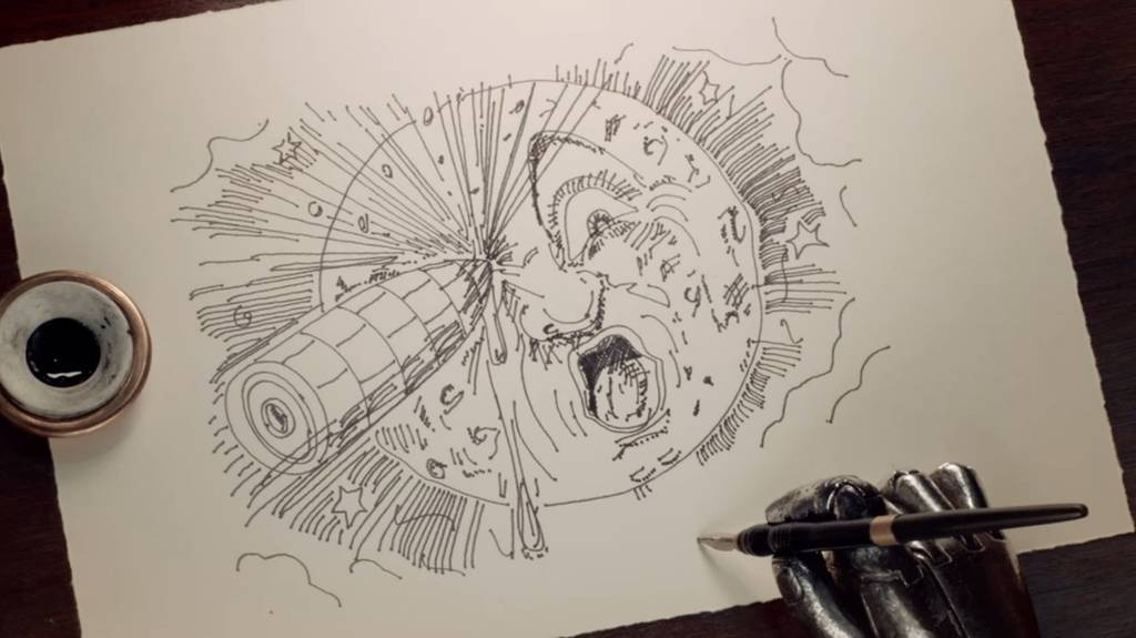 There are quite a few items in this film that are narratively important as they help connect our main character, Hugo, with Georges Méliès and reveal Georges’s true identity. Hugo’s father’s notebook, Mama Jeanne’s heart-shaped key, and Méliès’s drawings in the box on top of the wardrobe are all clues that lead the main character on his journey of discovery. The most essential props in the film are also the ones that are most visually arresting. These are the automaton and drawing that it creates, which ultimately connects the automaton with Méliès and leads Hugo to discover Méliès’s past (Figures 3 and 4). I found this prop so interesting that I did some research into its making. I expected it to be at least partially computer-generated. I certainly expected the process of creating the drawing to be artifice. I was wrong. It turns out that the automaton was created by famous prop maker Dick George and was completely real. Even more surprising, the automaton actually draws the entire picture. (Figure 4). According to George, it takes “46 or 47 minutes” to complete the whole image (Lytal).