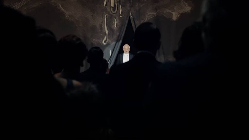 Like most films, lighting is used in Hugo for a variety of purposes. Most of the time, the lighting is meant to seem completely practical, having come from various sources on the screen, such as overhead lamps, wall lamps, or streetlamps. One of the fantastic things that Scorsese does in this film is use lighting to help the audience feel the atmosphere that our character is in. An excellent example of this would be when Hugo and Isabelle meet for the first time outside of Georges’s house (Figure 5). The characters are standing in pools of yellow/orange light being cast by street lamps or through the door of the home. The cityscape that we see behind and around the characters is dark and lighted in blue hues. This lighting choice, coupled with the visible snow in the scene, gives the scene a cold feeling. The orange-hued light from the house door and window says to us that the home is warm and inviting. Another way that lighting is used in this film is to separate characters from their surroundings. A perfect example would be the scene at the end of the film when Georges is onstage introducing his film (Figure 6). In this scene, Georges is bathed in light while the audience is cast almost wholly in shadow. This is important because it’s the moment where the character is finally being appreciated for his work. Georges is suddenly thrust into the literal and figurative spotlight.